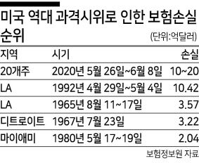 앞선 최고치 보험 손실은 1992년 로스앤젤레스(LA)에서 있었던 ‘로드니 킹’ 사건을 계기로 한 시위(4월29~5월4일)로 조사됐다. 당시 손실액은 7억7500만달러인데, 현재 가치로 환산하면 10억4200만달러에 달한다. 역대 보험손실 상위 10위안에 드는 시위는 모두 특정 도시에서 발생한 걸로 확인된다.