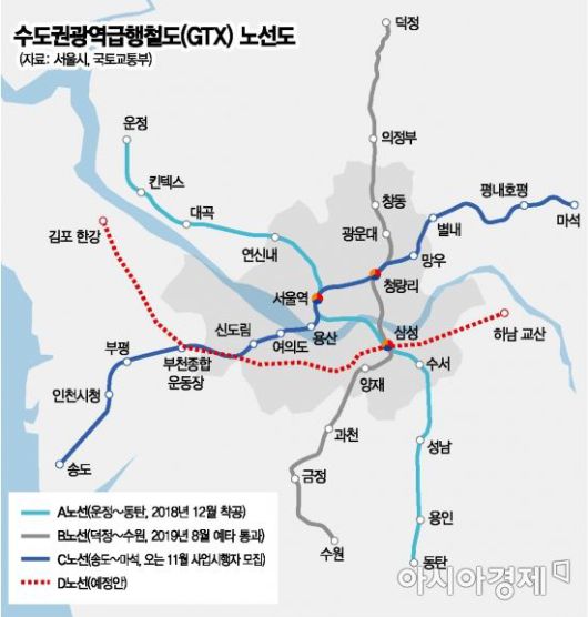 [아시아경제 이춘희 기자] 수도권 광역급행철도(GTX)가 수도권 집값의 새로운 뇌관으로 떠오르고 있다. 정부는 아직 '서부권 GTX'를 검토하겠다는 원론적 입장이지만 경기도 내 일선 지방자치단체들은 이를 사실상의 'D노선'으로 보고 치열한 유치경쟁에 나선 상황이다. 이미 기존 GTX 노선 주변 집값이 상승세를 타고 있는 상황에서 'D노선' 역시 집값을 자극할 요인이 될 전망이다.