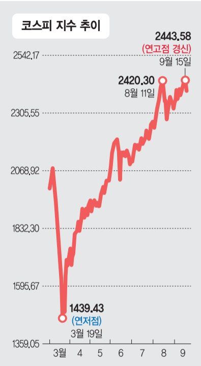 17일 금융투자업계에 따르면 코로나19 사태로 지난 3월 19일 코스피는 장중 1439.43의 연저점을 기록했다. 이후 변동장세 속에서도 반등하기 시작해 지난 8월 11일 장중 2400 선을 회복했다. 지난 15일에는 2443.58로 장을 마감하며 연고점을 경신했다.