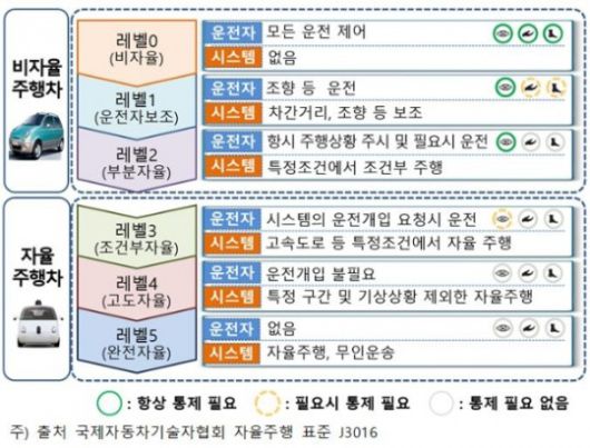자동차에 내장된 자율주행시스템이 자동차 운전을 통제하는 수준에 따라 통상 6단계(Level 0 ~ Level 5)로 구분하고, 통상 레벨3(조건부 자율주행) ~ 레벨5(완전 자율주행)를 자율주행차로 간주한다.