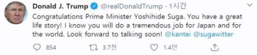 도널드 트럼프 미국 대통령은 17일(현지시간) 트위터를 통해 스가 요시히데(菅義偉) 신임 일본 총리를 향해 축하 메시지를 보냈다. 사진은 트럼프 대통령의 해당 트윗 캡처.뉴시스 |