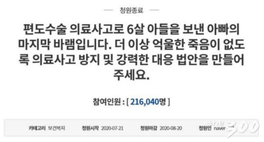 지난 7월 21일 '억울한 죽음이 없도록 의료사고 방지 및 강력한 대응 법안을 만들어 달라'는 제목으로 올라온 청원 글은 한 달만에 21만6040명의 동의를 받았다.