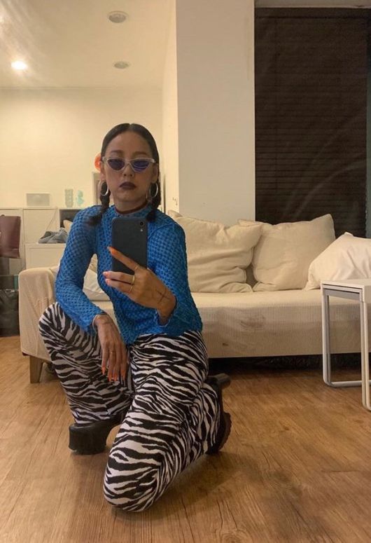 사진 속에는 화려한 패턴의 파란색 블라우스와 얼룩말 패턴 바지를 입은 이효리의 모습이 담겼다. 이효리는 여기에 벽돌처럼 부꺼운 통굽 신발을 신고 개성 넘치는 스타일링을 완성했다.