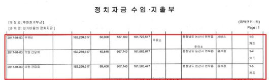 국민의힘 조수진 의원실이 18일 공개한 정치자금 지출 내역에 따르면, 추 장관은 2017년 1월 3일 충남 논산군 연무읍에서 3차례에 걸쳐 정치자금을 결제했다. 주유소에서 5만원, 소고기 음식점에서 두 차례에 걸쳐 14만원(4만원, 10만원)을 결제했다. 추 장관은 “주유비”와 “의원 간담회”로 지출 명목을 적었다.