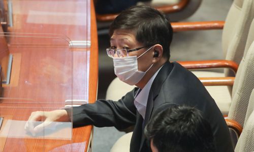 김홍걸 더불어민주당 의원이 지난 16일 오후 서울 여의도 국회 본회의에서 열린 경제분야 대정부질문에 참석해 자리하고 있다. 뉴스1 |