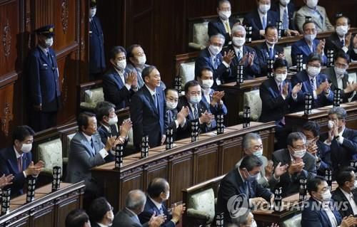 (도쿄 EPA=연합뉴스) 일본 집권 자민당 스가 요시히데 총재가 16일 도쿄 중의원에서 새 총리로 선출된 직후 의원들의 박수를 받으며 자리에서 일어서 있다. 이날 표결에 참여한 자민당의 다카토리 슈이치의원이 18일 코로나19 양성 판정을 받았다. |