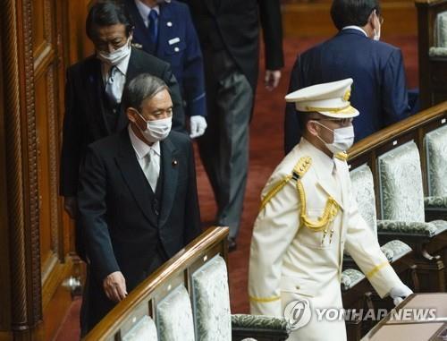 (도쿄 EPA=연합뉴스) 스가 요시히데 일본 신임 총리가 지난 17일 열린 임시국회 개회식에 마스크를 쓴 채 입장하고 있다. |
