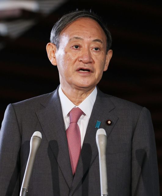 스가 요시히데 일본 신임 총리가 17일 도쿄 총리 관저에 도착해 취재진 앞에서 발언하고 있다. /지지통신 연합뉴스 |