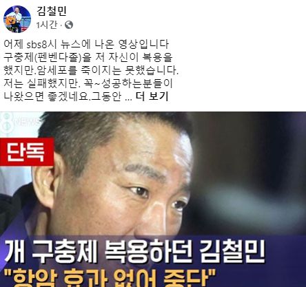 19일 김철민은 자신의 페이스북을 통해 "구충제(펜벤다졸)를 저 자신이 복용했지만, 암세포를 죽이지는 못했다"고 말했다.