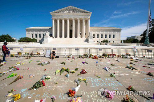 루스 베이더 긴즈버그 대법관을 추모하는 꽃이 놓인 미국 연방대법원 앞 거리 [AFP=연합뉴스] |