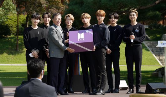 문재인 대통령이 19일 오전 청와대 녹지원에서 열린 제1회 청년의날 기념식에서 방탄소년단(BTS)으로부터 음악적 성과물과 메시지 등을 담은 '2039년 선물'을 받고 있다. /뉴시스 |