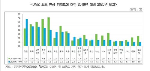연구원은 지난해 판문점 북미 정상회담, 올해 개성 남북공동 연락사무소 폭파 등 DMZ를 둘러싼 국내외 정치적 변화에 의한 단기적 인식 변화를 반영한 것으로 분석했다.