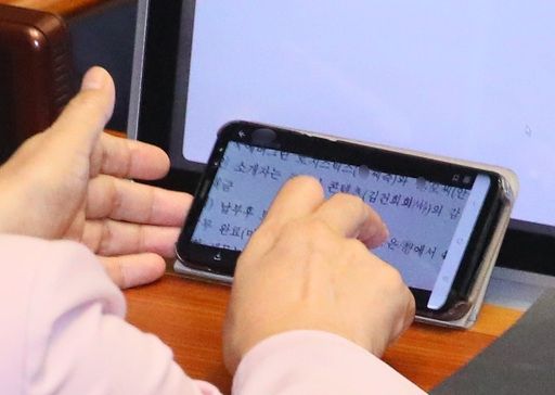 국회 본회의장에서 추미애 법무부 장관이 휴대전화로 윤석열 검찰총장의 장모 관련 의혹에 관한 자료를 보는 모습. 연합뉴스 |
