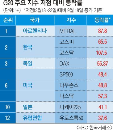 코스피의 저점 대비 상승률은 주요 20개국(G20)의 주요 지수 중 최상단에 해당된다. 코스피보다 더 많이 뛰어오른 지수는 아르헨티나의 메르발지수(87.82%)밖에 없다. 미국 다우존스(48.7%), S&P500 지수(48.3%), 나스닥지수(57.32%)도 코스피보다 많이 오르지 못했다. 특히 코스닥지수 상승률은 아르헨티나도 뛰어넘었다.