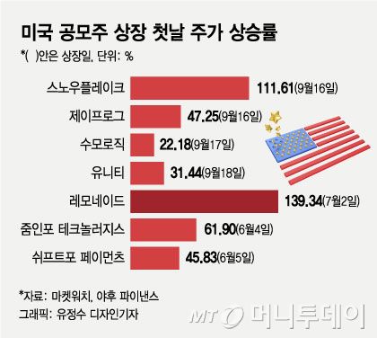 스노우플레이크와 같은 날 상장한 소프트웨어 업체 '제이프로그(JFrog)'는 이날 장중 75%까지 폭등했다. 같은 주 상장한 AI(인공지능) 소프트웨어 개발업체 '수모 로직'(22.18%)과 비디오게임 소프트웨어 기업 '유니티'(31.44%) 등도 상장일 상당한 수익률을 거뒀다.