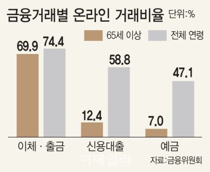 실제 고령층의 비대면 금융 이용은 매우 기본적인 수준에 그친다. 금융위원회 조사에 따르면, 지난 3월 기준 65세 이상이 이체와 출금을 온라인으로 이용한 비율은 69.9%였다. 전체 평균인 74.4%보다 약간 낮은 수준이다. 그런데 신용대출이나 온라인 예금은 격차가 매우 커진다. 60대 이상의 온라인 신용대출은 12.4%, 온라인 예금 가입은 7.0%에 그쳤다. 전체 평균은 각각 58.8%와 47.1%다. 디지털 금융에서 조그만 절차가 복잡해져도 노인들이 접근하지 못한다는 뜻이다.