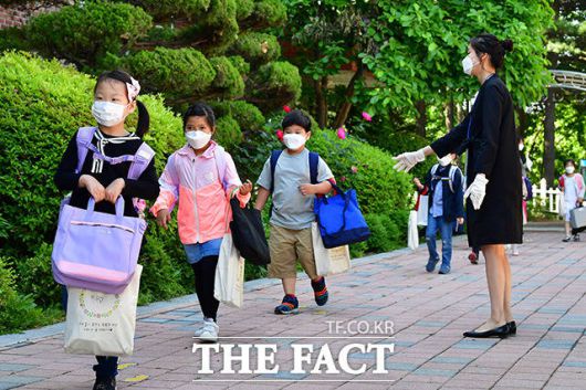 초등학교 1~2학년이 등교 수업을 시작한 지난 5월27일 오전 서울 송파구 세륜초등학교에서 학생들이 등교를 하고 있다./남용희 기자 |
