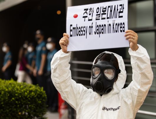 지난 7월 서울 종로구 주한일본대사관 앞에서 열린 '후쿠시마 오염수 방류 반대 기자회견'에서 그린피스 회원들이 관련 퍼포먼스를 하고 있다. [연합] |