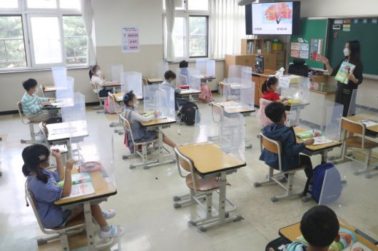 수도권 지역 유·초·중·고 학생들의 등교가 재개된 21일 오전 경기도 수원시 영통구 원일초등학교에서 1학년 학생들이 수업을 받고 있다.(사진=연합뉴스) |