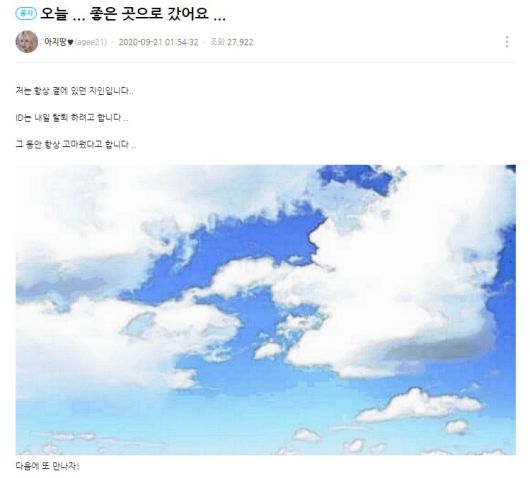 지인은 "저는 항상 곁에 있던 지인이다. ID는 내일 탈퇴하려고 한다. 그동안 항상 고마웠다고 한다"는 글과 함께 하늘 사진을 올리며 아지땅의 사망 소식을 전했다.