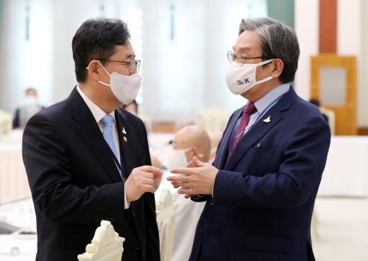 노영민 대통령 비서실장과 박양우 문화체육관광부 장관이 18일 오전 청와대 본관에서 열린 한국 불교지도자 초청 간담회에 참석해 이야기를 나누고 있다./연합뉴스 |