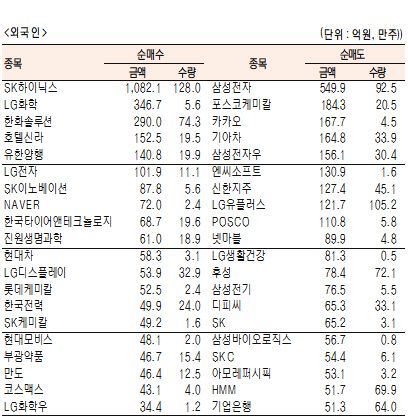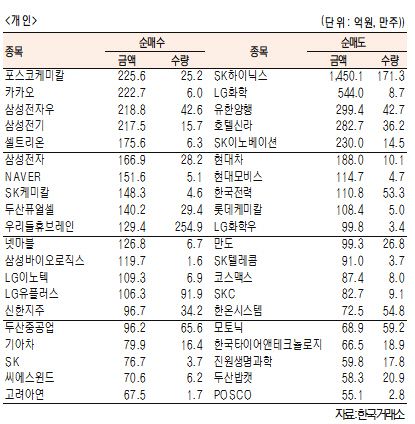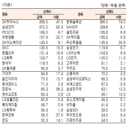 [표]유가증권 기관·외국인·개인 순매수·도 상위종목(9월 21일-최종치)