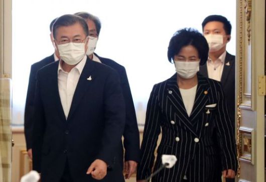 이날 문재인 대통령은 청와대에서 열린 제 2차 국정원·검찰·경찰 개혁 전략회의에서 추미애 법무부 장관과 함께 등장했다.