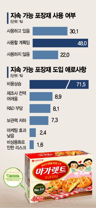 이처럼 친환경 포장재 개발에 적극 나서고 있지만 적게는 수억원, 많게는 수십억원이 소요되다 보니 규모가 작은 곳은 쉽게 도입하지 못하고 있다. 한국농수산식품유통공사 관계자는 "정책적 측면에서 식품ㆍ외식업계가 지속 가능 식품 포장을 적극적으로 도입, 활용할 수 있도록 기업에서 겪고 있는 비용 및 연구개발 부담을 해소할 수 있는 지원책을 마련해야 할 것"이라고 밝혔다. 비대면 소비 확산으로 사용량이 잦아진 '배달 용기'와 관련한 고민 역시 수반돼야한다고 강조했다.
