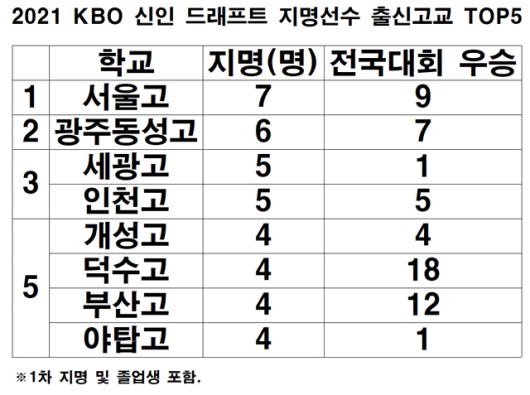 이날 세광고 출신들의 이름은 드래프트 초반부터 후반부까지 여러 번 불렸다. 1라운드 5순위 지명권을 가진 KT가 권동진(원광대·세광고 졸업생)을 호명한 이후 7순위 지명권을 가진 LG가 이영빈을 지명했고, 올 시즌 9위로 추락해 반등의 계기를 마련해야했던 SK는 상위인 2, 3라운드에서 고명준(18순위), 조병현(28순위)의 이름을 불렀다. 김선기, 윤정현, 조병규 등 여러 명의 세광고 출신 선수를 보유한 키움도 8라운드(79순위)에서 정연제(한일장신대·세광고 졸업생)라는 새 얼굴을 수혈했다. 이날 세광고는 서울고(7명), 광주동성고(6명)에 이어 전국고교 중 세 번째로 많은 프로선수를 배출했다.