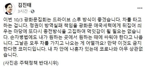 김진태 전 의원은 22일 오전 페이스북에 올린 글에서 “이번 10월3일 광화문집회는 드라이브 스루 방식이 좋겠다”며 “차를 타고 (집회를) 하는 거다”라고 주장했다. 이어 “정권이 방역실패 책임을 광화문 애국세력에게 뒤집어씌우는 마당에 또다시 종전방식을 고집해 먹잇감이 될 필요는 없다”고 이유를 설명했다.