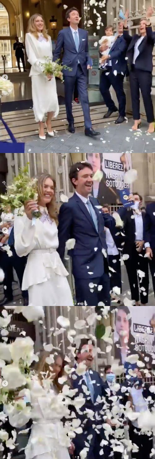 사진 속 나탈리아 보디아노바는 웨딩드레스를 연상시키는 하얀 스커트 정장을 입고 있다. 그는 네이비색 슈트를 차려 입은 앙투안 아르노와 손을 잡은 채 등기소를 빠져나오며 지인들의 축하를 받고 있다. 부케를 든 채 결혼 서약 후 결어나오는 나탈리아 보디아노바가 활짝 웃고 있다. 앙투안 아르노 역시 행복한 표정을 숨기지 못하고 있는 모습이다.