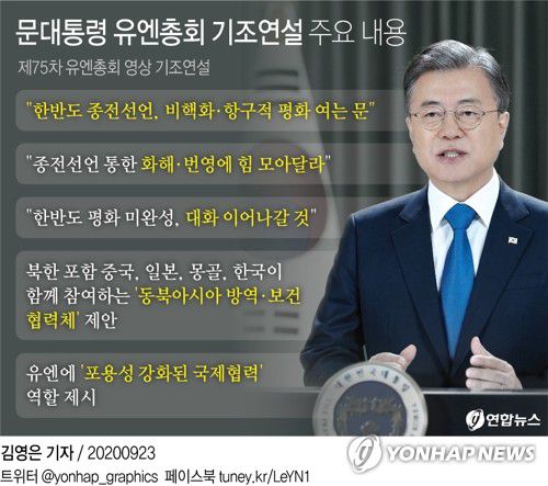 (서울=연합뉴스) 박경준 기자 = 문재인 대통령이 취임 후 네 번째로 한 유엔총회 기조연설에서 국제사회를 향해 한반도 종전선언의 중요성을 역설했다.