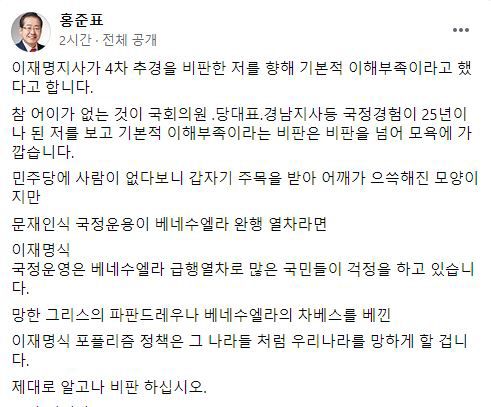 이어 “망한 그리스 파판드레우나 베네수엘라의 차베스를 베낀 이재명식 포퓰리즘 정책은 그 나라들처럼 우리나라는 망하게 할 것”이라며 “제대로 알고나 비판하라”고 지적했다.