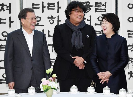 지난 2월 20일 문재인 대통령과 부인 김정숙 여사가 올해 미국 아카데미 영화상 4관왕에 빛나는 ‘기생충’의 봉준호 감독(가운데)과 청와대에서 오찬을 함께하기 전 환담을 나누고 있다. 청와대사진기자단 |