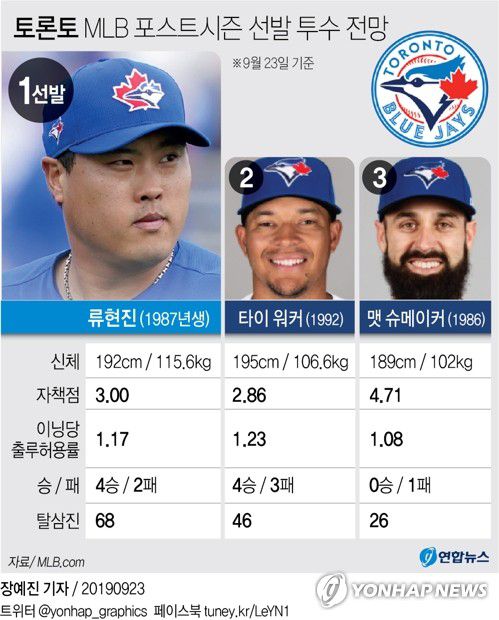 (서울=연합뉴스) 최인영 기자 = 미국프로야구 메이저리그 토론토 블루제이스의 에이스 류현진(33)이 예상대로 토론토의 포스트시즌 1선발로 나설 전망이다.