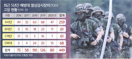 국회 국방위원장인 더불어민주당 민홍철 의원이 해병대사령부 등에서 제출받은 자료 등에 따르면, 2016년부터 최근까지 해병대에서 운용하는 열상감시장비(TOD·생물과 물체의 적외선을 감지해 영상으로 변환하는 장비)에서 모두 449건의 고장이 발생한 것으로 나타났다. 2016년 75건과 2017년 58건에 그쳤지만 2018년 110건, 2019년 126건으로 급증세다.