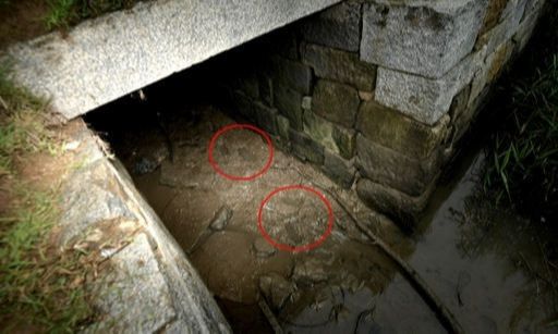 탈북자 김모씨가 북한으로 월북할 때 이용한 것으로 추정되는 인천 강화군의 한 배수로. 김씨의 것으로 보이는 발자국(빨간 원)이 남아 있다. 세계일보 자료사진 |