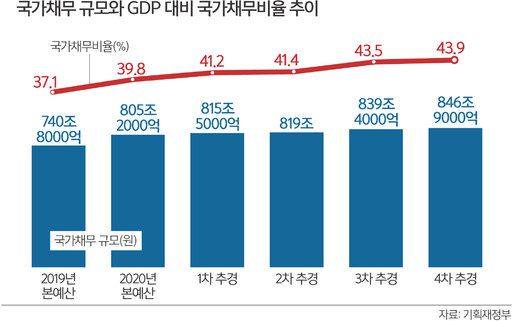 정부가 4차 추경 재원 가운데 7조5000억원을 적자 국채를 발행키로 하면서 국가채무는 846조9000억원으로 불어난다. GDP 대비 국가채무 비율은 43.9%로 전년도 본예산 기준 37.1%보다 무려 6.8%포인트나 급등했다. 3차 추경 기준 43.5%보다도 0.4%포인트 불어난다. 재정수지적자 비율, 국가채무비율 모두 역대 최대 수치다.