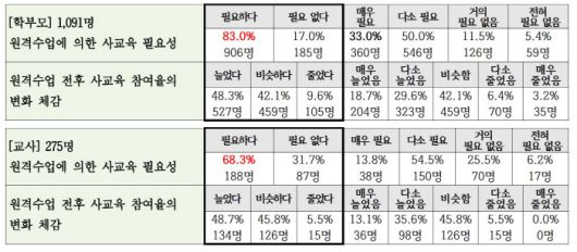 또한 원격수업 전후 사교육 참여에 대해 '늘었다'는 답변이 전체 응답자 중 48.3%로 가장 높았고, '비슷하다'(42.7%)는 응답이 뒤를 이었다. 줄었다는 응답은 9%에 불과했다.