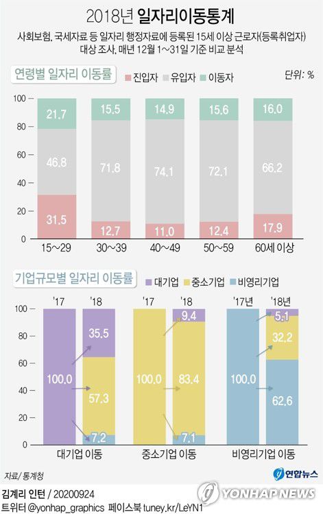 김진 통계청 행정통계과장은 "30대 미만은 학업을 마치고 직장을 찾는 과정에서 안정된 일자리로 이동하는 경향이 있다 보니 이동률이 높다"면서 "50·60대의 경우 은퇴 후 새로운 직장으로 이동하는 등 정년을 앞두고 일자리를 옮긴 것으로 추정된다"고 설명했다.
