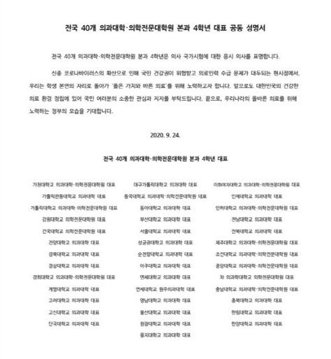 전국 40개 의과대학·의학전문대학원 본과 4학년 대표들은 24일 “전국 40개 의대·전원 본과 4학년은 국시에 대한 응시 의사를 표명한다”는 공동성명서를 발표했다. 이들은 “신종 코로나바이러스 감염병 확산으로 국민 건강권이 위협받고 의료인력 수급 문제가 대두되는 시점에서 우리는 학생 본연의 자리로 돌아가 옳은 가치와 바른 의료를 위해 노력하고자 한다”고 했다.
