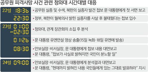 이후 22일 오후 10시30분 정부는 ‘북한이 월북의사를 밝힌 실종자를 사살 후 시신을 불에 태웠다’는 첩보를 입수했다. 이때부터 청와대와 정부는 긴박하게 돌아갔다.