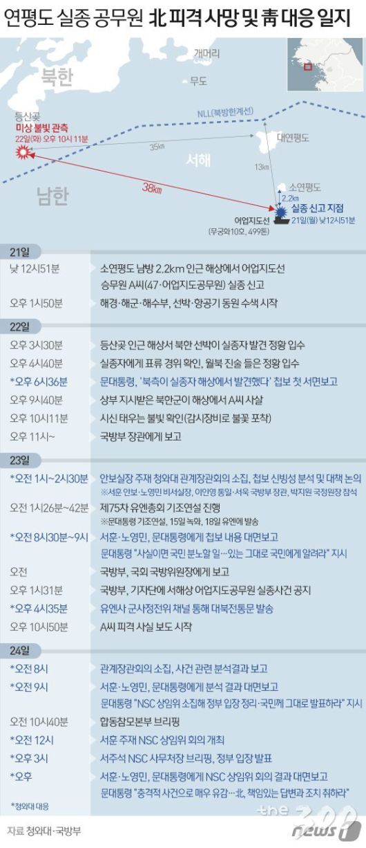 24일 청와대와 국방부에 따르면 문 대통령은 '실종'부터 '피격 및 시신훼손'까지 이번 사건에 관해 총 4차례 보고를 받았고, 청와대 위기관리센터는 군당국과 실시간으로 첩보를 공유, 분석했다. 국가안전보장회의(NSC) 회의와 관계장관회의는 각각 1차례, 2차례 열렸다.