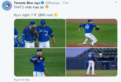 류현진은 25일(한국시간) 미국 뉴욕주 버팔로에 있는 살렌필드에서 뉴욕 양키스를 상대로 7회까지 5안타 무실점 역투했다. 출처 | 토론토 공식 SNS |