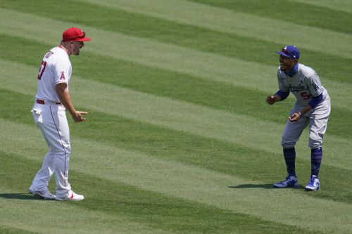 LA 에인절스 마이크 트라웃(왼쪽)과 LA 다저스 마이크 트라웃이 지난 8월 프리웨이 시리즈에 앞서 서로 반갑게 만나고 있다. AP연합뉴스 |