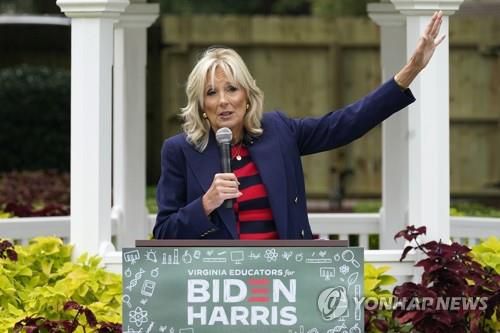 (노퍽 AP=연합뉴스) 조 바이든 미국 민주당 대통령 후보의 부인인 질 바이든이 24일(현지시간) 버니지아주 노퍽에서 군인가족들과의 간담회에 참석해 연설하고 있다. |