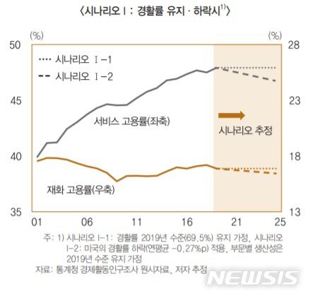 특히 코로나19 영향이 장기화될 경우 서비스업을 중심으로 고용률 충격이 더 커질 수 있다는 관측이다. 우리나라의 경제활동참가율(경활률)이 미국의 경활률 하락 추세(1997~2015년중 연평균 -0.27%포인트)와 마찬가지로 하락하는 시나리오 하에서 서비스부문의 고용률은 2019년 47.9%에서 2025년 46.7%로 하락하는 것으로 추정됐다. 재화부문 고용률보다(16.9%->16.4%) 더 큰 폭 하락한다는 것이다.