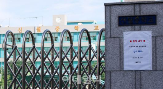 학생들의 등교가 재개된 서울에서 양천구 신월중학교 3학년 학생이 확진 판정을 받아 24일 오전 서울 양천구 신월중학교에 신월5동 동사무소 직원들이 나와 방역을 하고 있다. 신월중 측은 23일 오전 방역당국으로부터 학생 확진 통보를 받고 수업을 진행 중이던 학생들과 교직원을 전원 귀가시켰다.(사진=뉴시스) |