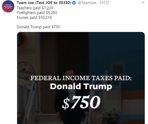 영상은 미국의 보통 초등학교 교사의 연 소득세가 7천239달러, 소방관 5천283달러, 간호사 1만216달러인데 반해 트럼프 대통령은 훨씬 적은 액수인 750달러만 납부했다고 강조했다.