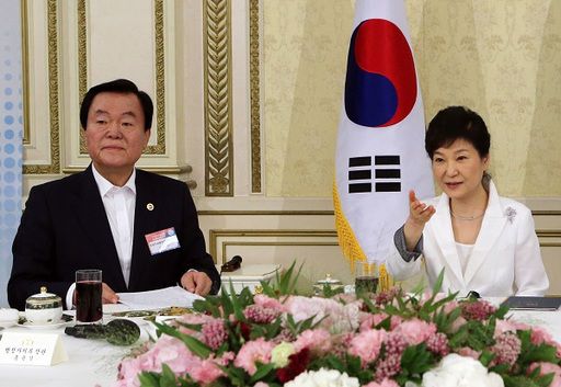 2016년 7월 김경재 당시 한국자유총연맹 총재(왼쪽)가 박근혜 당시 대통령과 청와대에서 오찬을 함께하는 모습. 세계일보 자료사진 |